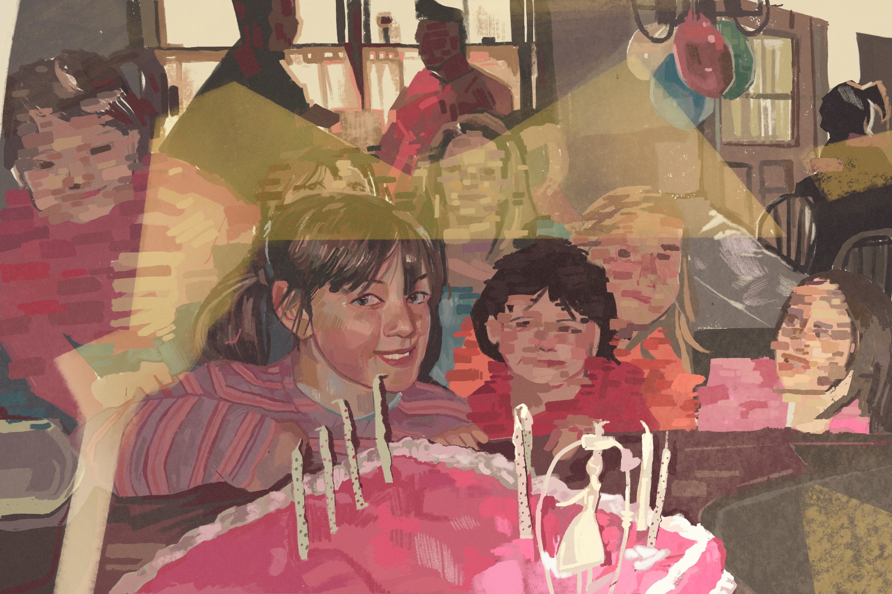 Two illustrations depicting scenes from childhood and representing nostalgia and memory; faces are blurred and the memories feel hazy.