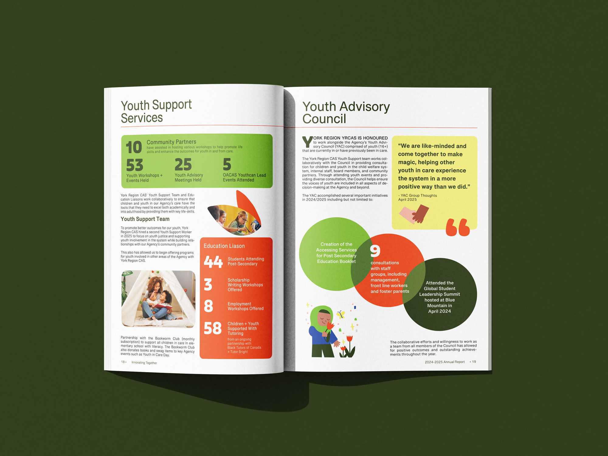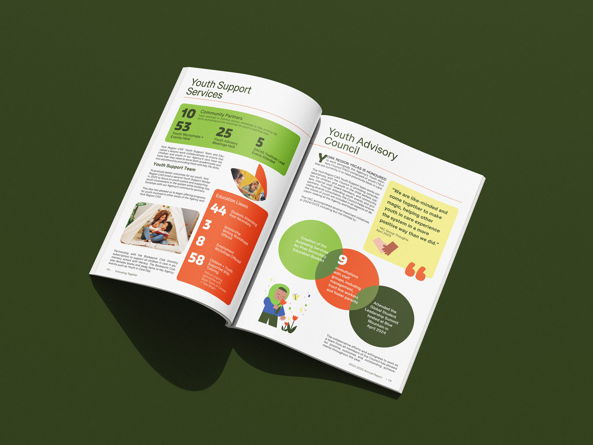 As an expansion of the project, I decided to re-design the YRCAS’ 2024-2025 Annual Report on my own, and applied the brand guidelines we created to the publication. This was a great exercise that allowed me to organize data and create an editorial layout system that was easy for readers to navigate.